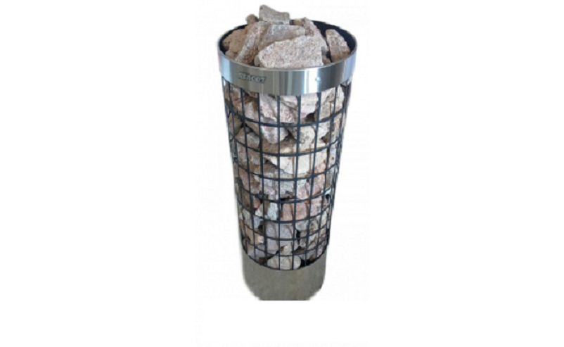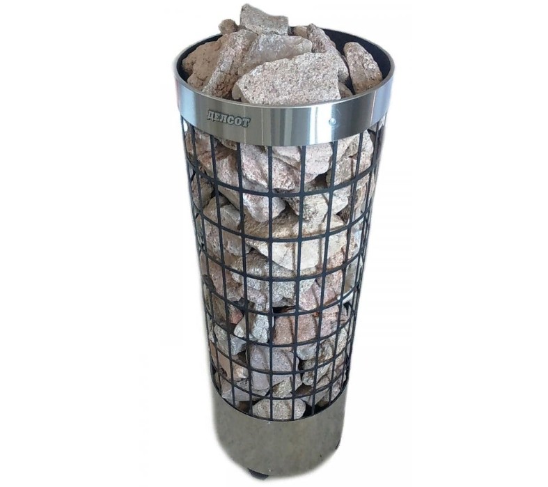 Особенности: цилиндрическая форма с прямоугольными вырезами на всей поверхности (конструкция в виде сетки), что обеспечивает комфортные условия нагрева помещения. Можно регулировать характер тепла от мягкого до сильного: достаточно плеснуть воды на боковую часть каменки или прямо сверху на камни.
