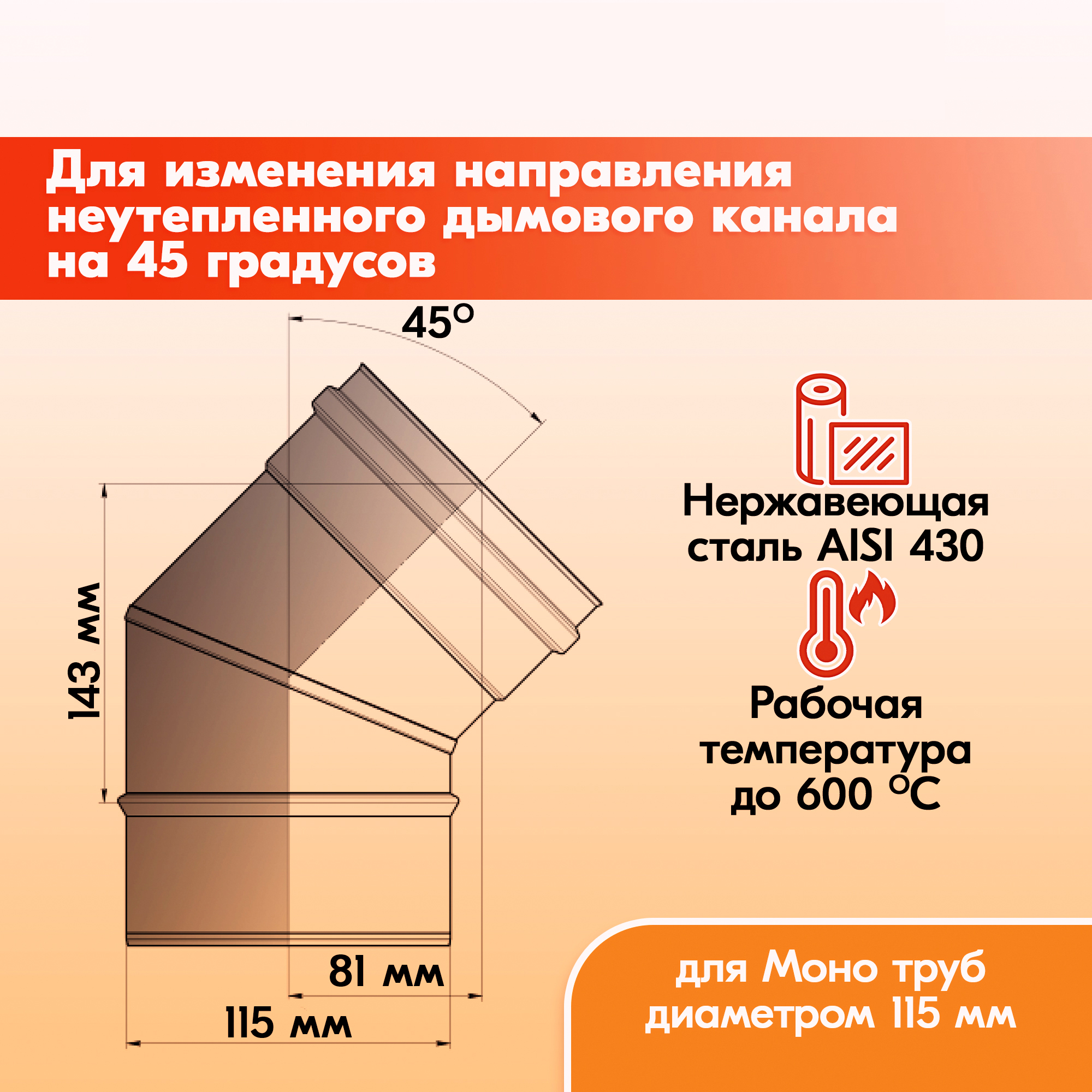 Одноконтурный отвод дымохода Моно подходит для установки на печное оборудование отапливаемое газом, дровами или пеллетами.