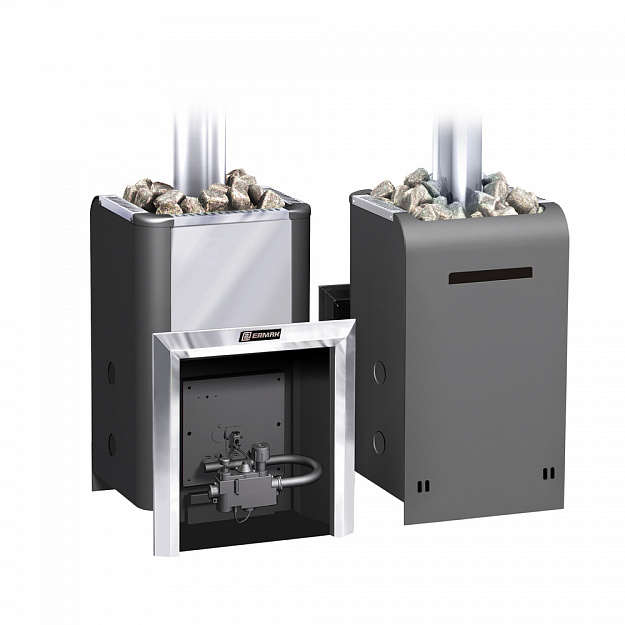 -Мощная горелка (16 кВт) с энергонезависимой автоматикой регулирования и безопасности. С возможностью работы на пропане, при установке дополнительного комплекта жиклеров (опция). Работает в автоматическом режиме по заданной температуре в парилке (+70 .. +120 °C).