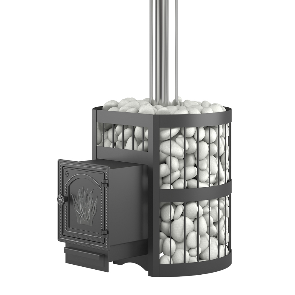 По всей высоте в сетку укладываются камни для бани. Заклад обеспечивает работу открытой каменки, а также равномерно распределяет тепло в пространстве парной. Камни в сетке долго удерживают тепло после нагрева и улучшают тепловые характеристики печи.
