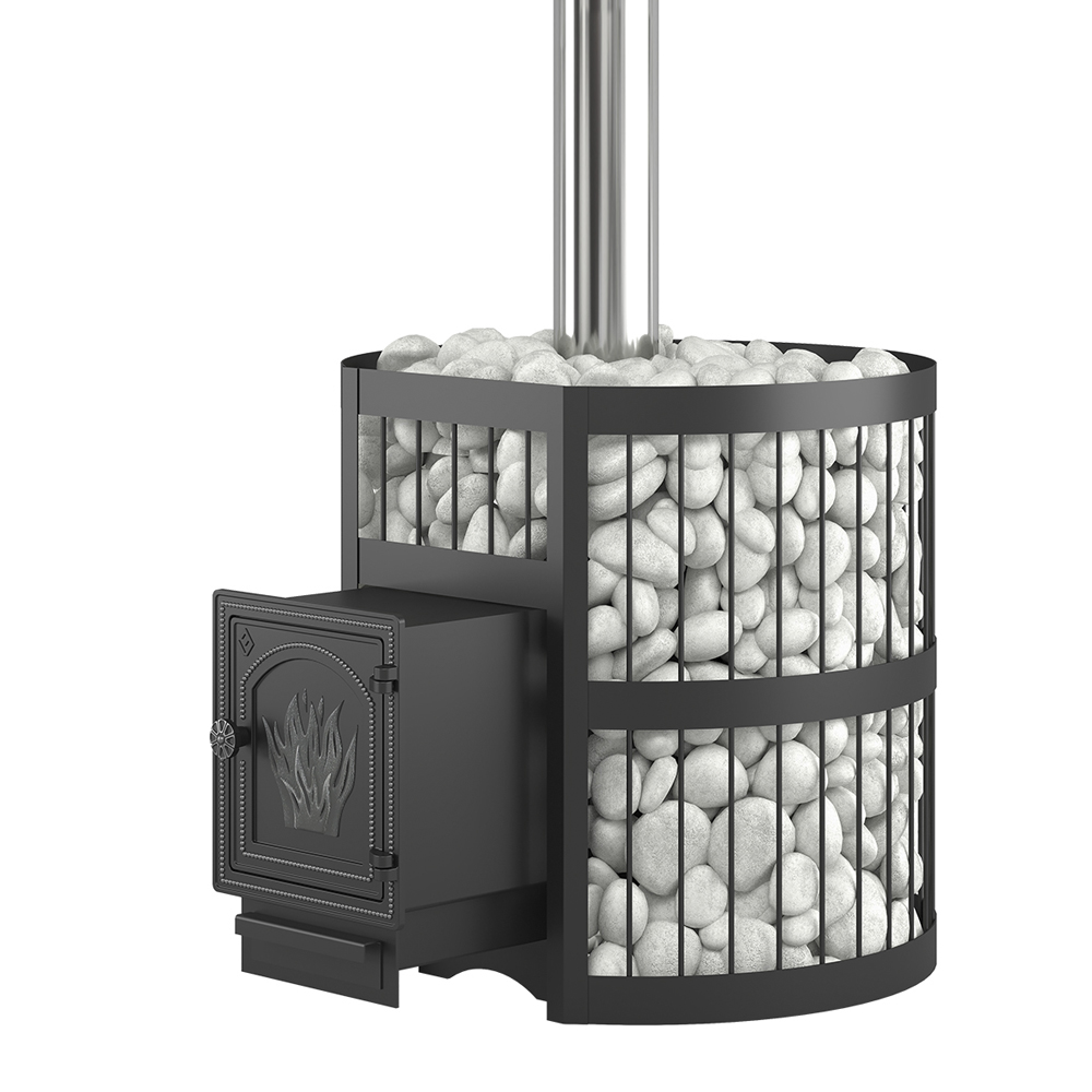 По всей высоте в сетку укладываются камни для бани. Заклад обеспечивает работу открытой каменки, а также равномерно распределяет тепло в пространстве парной. Камни в сетке долго удерживают тепло после нагрева и улучшают тепловые характеристики печи.