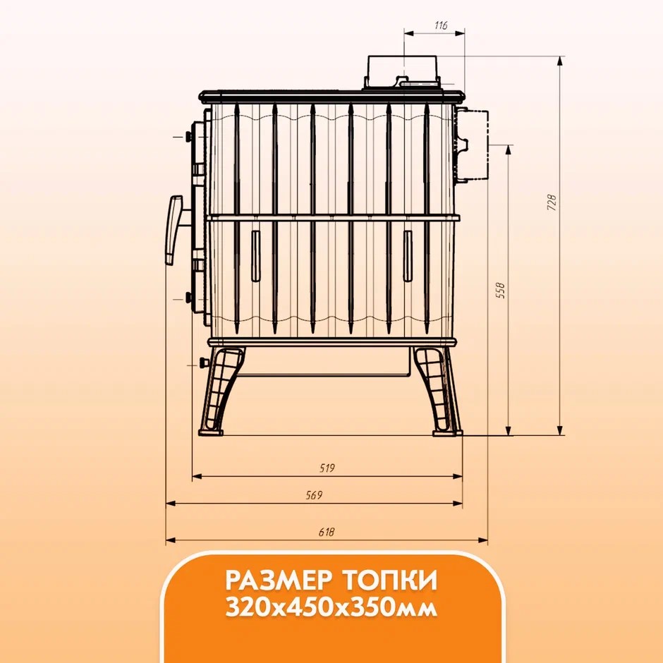 Боковые стенки конструкции металлической дровяной печи «Бахта» выполнены в формате радиаторов, увеличивающих общую площадь поверхности печи.