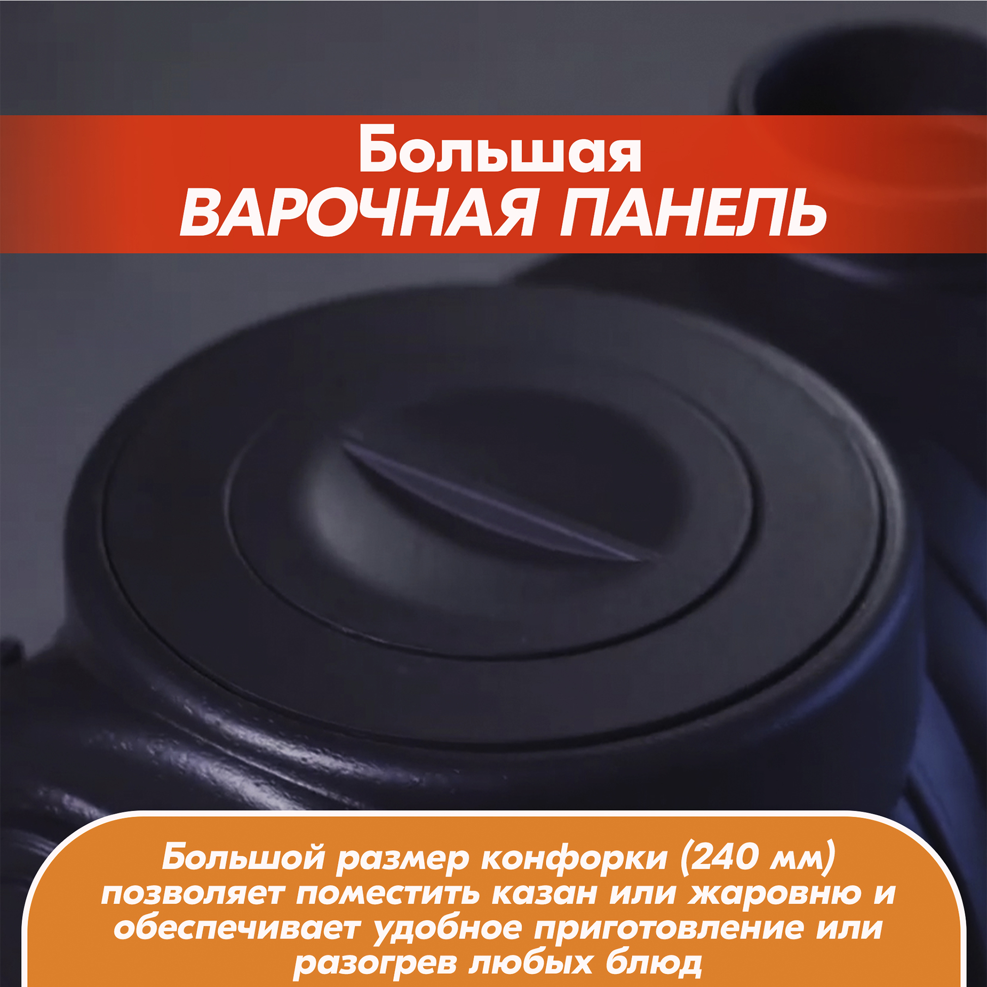 Большой размер конфорки позволяет поместить казан или жаровню, а также Вы легко сможете приготовить или разогреть ваши любимые блюда, вскипятить чайник или сварить кофе.